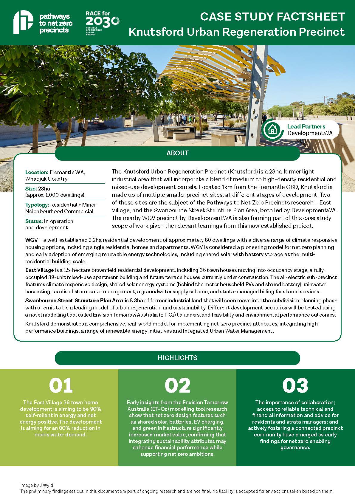 East Village at Knutsford is a 1.5-hectare brownfield residential development, including 36 town homes, an apartment building and future terrace homes. The all-electric sub-precinct features climate responsive design, shared solar energy systems, rainwater harvesting, localised stormwater management, a groundwater supply scheme, and strata managed billing for shared services. The project will move from construction to occupancy over the life of the Net Zero Precincts project, providing valuable learnings on technology integration, commissioning and resident engagement.
